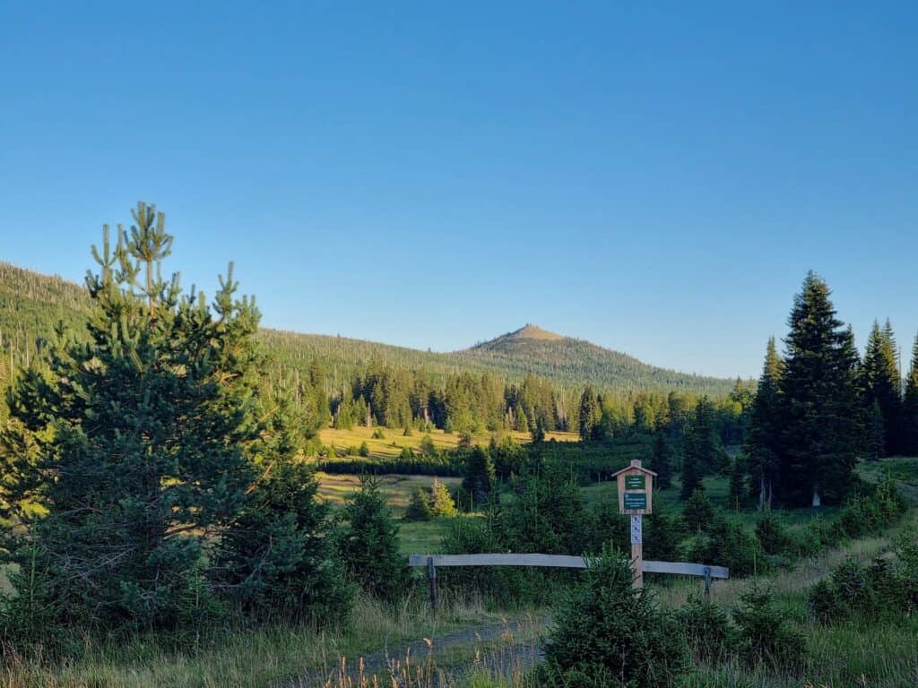 Březník na Šumavě - ein Ausflug von Horská Kvilda aus führt Sie in das Herz der Wildnis mit Blick auf den Berg Luzný. Die Route ist ideal für Wanderer und Radfahrer.